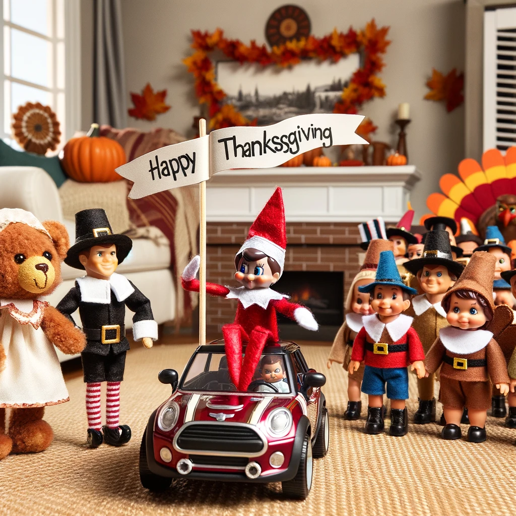 On Thanksgiving morning, the children discovered a delightful surprise: their Elf on the Shelf, Sparkle, had organized a miniature parade in the living room. Leading the way in a tiny remote-controlled car, Sparkle held a banner reading “Happy Thanksgiving!”